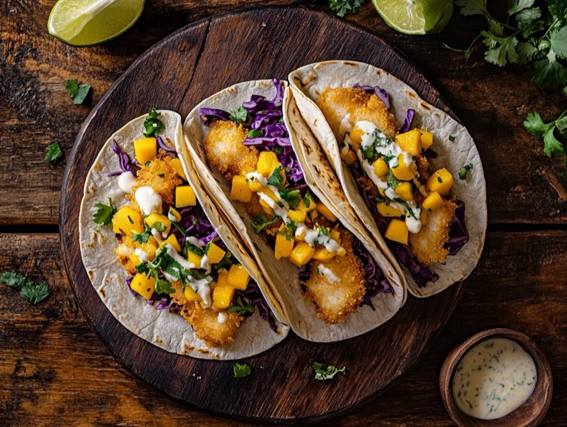 Sprø fish tacos med panert torsk, frisk mango-salsa og kremet limekrem. En fargerik og smakfull middag som tar under 25 minutter. Mangosalsaen gir en tropisk kontrast til den sprø fisken, og limekremen binder alt sammen. Perfekt for fredagstaco med et twist.