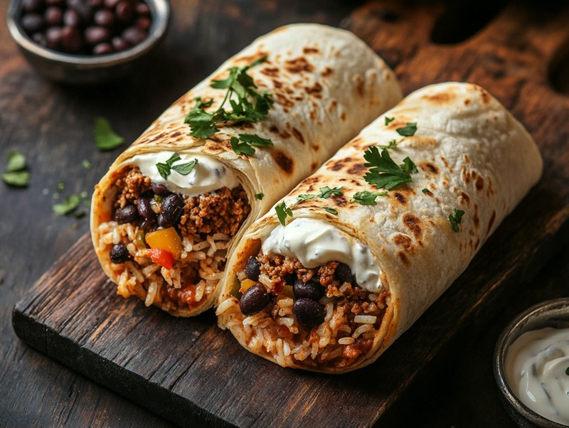 Store, fylte burritos med krydret kjøttdeig, ris, svarte bønner og friske grønnsaker. En mettende og balansert middag som er enkel å lage og lett å ta med. Perfekt for meal prep — rull flere og frys dem enkeltvis.