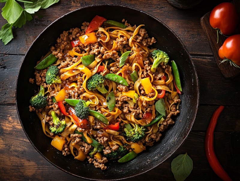 Rask og enkel wok med kjøttdeig, eggnudler og sprø grønnsaker i en smaksrik soyabasert saus. Klar på bare 20 minutter, noe som gjør den perfekt til travle hverdager. Grønnsakene stekes kort for å beholde sprøheten og næringsstoffene.