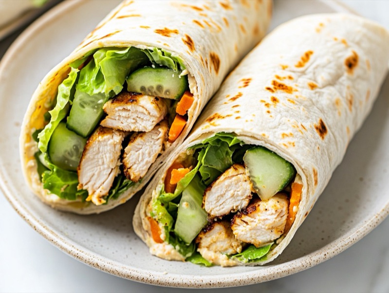 En frisk og proteinrik wrap med grillet kylling, kremet hummus og sprø grønnsaker. Klar på bare 10 minutter, og perfekt som rask lunsj eller matpakke. Wrapen holder seg godt innpakket i folie i opptil 24 timer — ideell for travle dager. Hummusen gir kremet tekstur uten å bruke ost eller dressing.
