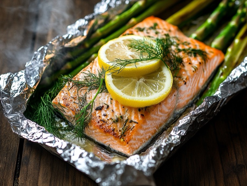Laks pakket i folie med smør, fersk dill og sitronskiver — stekes i ovnen til perfekt saftig konsistens. Folieteknikken holder all smak og fuktighet inne, og du får nesten null oppvask. Serveres med kokte nypoteter eller en enkel salat. Enklere blir det ikke.