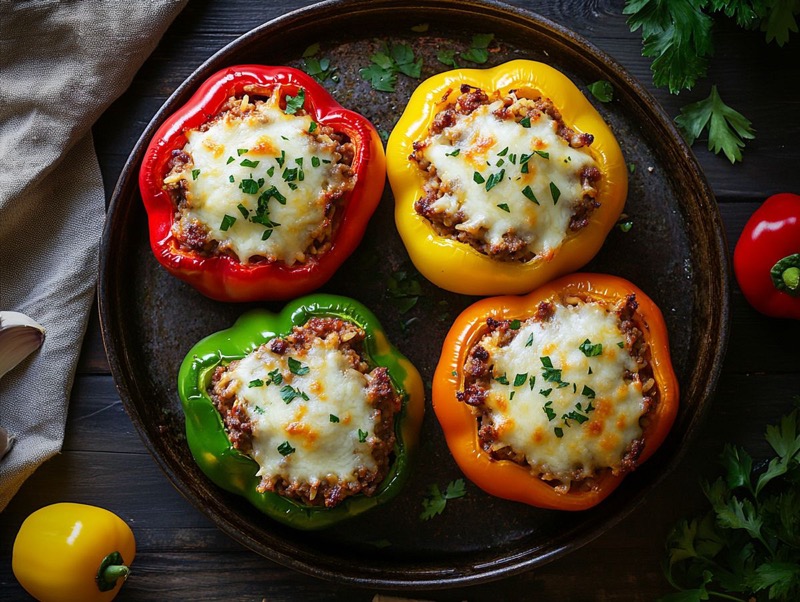 Fargerike paprikaer fylt med krydret kjøttdeig, ris og toppet med smeltet ost. En sunn og visuelt imponerende middag der paprikaen fungerer som en spiselig skål. Stekt i ovn til paprikaen er mør og osten er gyllen. Kan tilberedes på forhånd og stekes rett før servering.